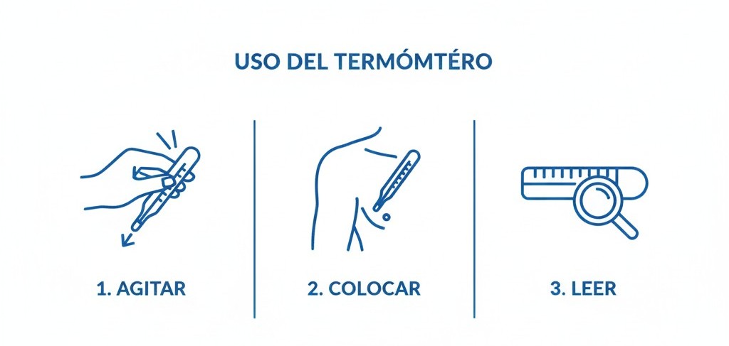 La idea es sencilla: preparar el termómetro, colocarlo en la zona adecuada, esperar el tiempo recomendado y leer la escala.